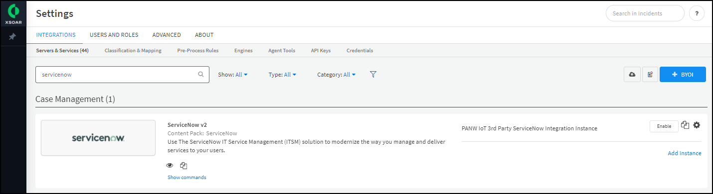 - Device Security uses Cortex XSOAR to integrate with ServiceNow, and the settings you must configure to integrate with it are in the XSOAR interface. To access these settings, click Launch Cortex XSOAR.The Cortex XSOAR interface opens in a new browser window.