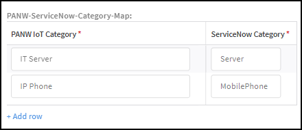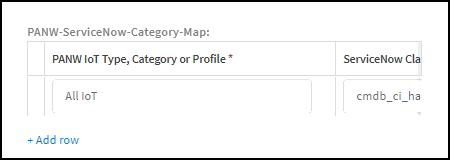 - Click + Add row and enter a name in the PANW IoT Category column and its corresponding name in the ServiceNow Category column.