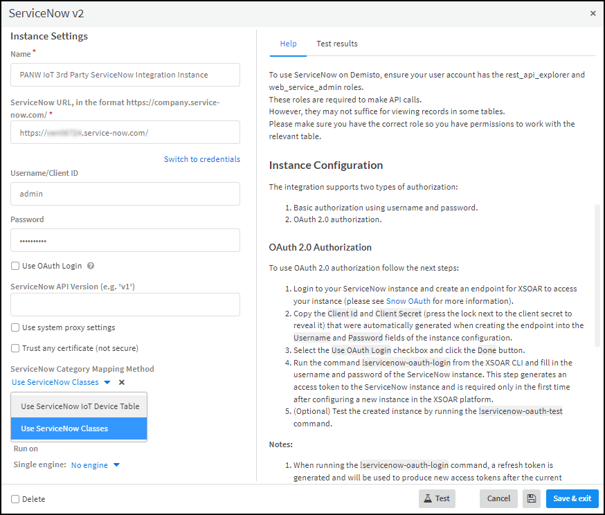 - Enter the following and leave the other settings at their default values:Name: Use the default name for the integration instance (PANW IoT 3rd Party ServiceNow Integration instance) or, if you use the mapping method based on ServiceNow classes, you can use the default name or enter a new one.When the ServiceNow Category Mapping Method is Use ServiceNow IoT Device Table, XSOAR jobs for ServiceNow use playbooks that refer to the default integration instance name specifically, so it cannot be changed. When the mapping method is Use ServiceNow Classes, you can use the default name or a new name, but then you must enter it in the Integration Instance Name field in the jobs that Cortex XSOAR will run using this instance.ServiceNow URL: Enter the URL of your ServiceNow account, including https:// .Username/Client ID: Enter the name of the user account you previously configured in ServiceNow.Password: Enter the password associated with the user account.Use OAuth Login: Select if you want XSOAR to use OAuth to log in and refer to the help in the right column on the page. Clear for XSOAR to use basic authentication with a username and password. Leave the other settings at their default values.ServiceNow Category Mapping Method: Choose the method you want to use to map devices and device attributes from IoT Security to ServiceNow. Use ServiceNow Classes (default method) maps Device Security device types, categories, and profiles to ServiceNow classes. Use ServiceNow IoT Device Table maps the labels for various device attributes in Device Security to their counterparts in a custom table in ServiceNow.