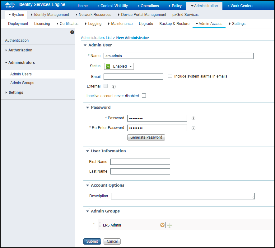 Create an ERS admin account.- Click AdministrationSystemAdmin AccessAdministratorsAdmin Users and then click AddCreate an Admin User.