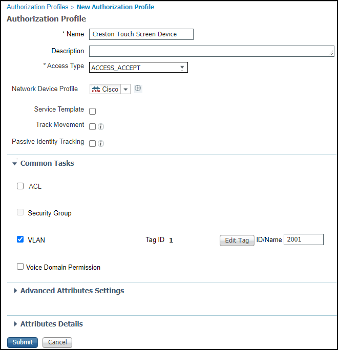 - Enter settings like those described below and leave the other settings at their default values:Name: Enter a name for the authorization profile; for example, Crestron Touch Screen Device.Access Type: ACCESS_ACCEPTDACL Name: PERMIT_ALL_TRAFFICVLAN: (select); Tag ID: 1; ID/Name: 2001, where 2001 is the ID number of the VLAN to which you want to assign all Crestron touch screen devices.
