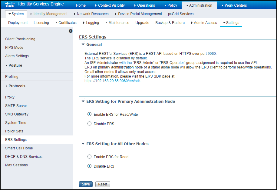 - Enable External RESTful Services.Log in to the Cisco Identity Services Engine management interface, click AdministrationSystemSettingsERS Settings, select Enable ERS for Read/Write in the ERS Setting for Primary Administration Node section, and then click Save.The setting in ERS Setting for All Other Nodes is not relevant to IoT Security integration.
