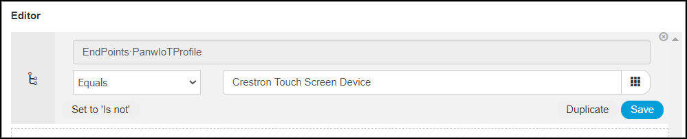 Log in to Cisco ISE and create a condition for an exception rule.- Click PolicyPolicy ElementsConditionsLibrary Conditions, enter the following in Editor:Click to add an attribute: EndpointsPanwIoTProfileOperator: EqualsAttribute value: Paste the IoT device profile name.