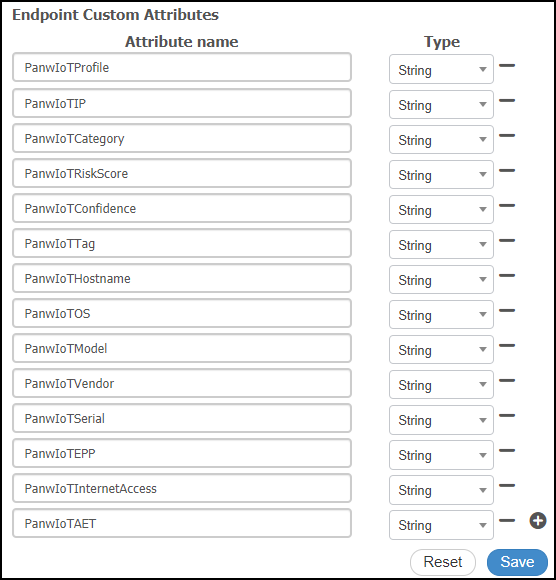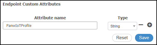 Create custom Device Security attributes.- Click AdministrationIdentity ManagementSettingsEndpoint Custom Attributes, enter PanwIoTProfile in the Attribute name field, choose String from the Type drop-down list, and then click Save.If you want to enter a different attribute name for the profile here, change the attribute name for the profile in Cortex XSOAR so they match each other. Similarly, if you customize any other attribute names in ISE, change the default names for their corresponding attributes in XSOAR. The attribute names are editable in the incremental and bulk export job settings for Cisco ISE in the Cortex XSOAR module. See Configure Device Security and Cortex XSOAR.