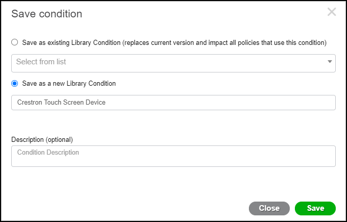 - In the Save condition dialog box, select Save as a new Library Condition, paste the profile name in the Condition Name field, and then Save the condition.The name of a library condition can contain letters, numbers, hyphens, underscores, periods, and spaces. If the IoT device profile name has any other characters such as parentheses, either remove or replace them with characters that are supported.