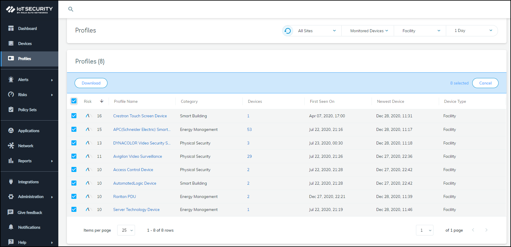 - In Device Security, click AssetsProfiles, optionally apply filters to display the device profiles you want to use, select them all by selecting the check box in the heading column, and then click Download.