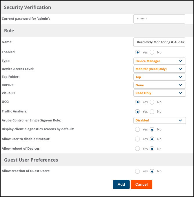 - Log in to your Aruba AirWave management platform.Log in to Aruba AirWave with an account that has administrator privileges. After logging in to the management platform, note the URL. You will need the URL when configuring the Aruba AirWave instance in Cortex XSOAR later.Create a Read-Only Monitoring & Auditing role to have read permissions for VisualRF.