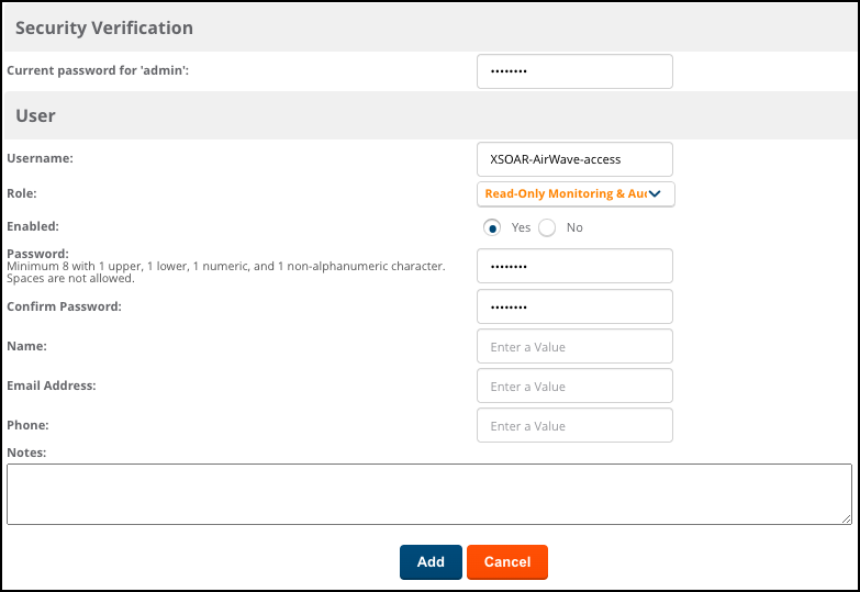 Add the new role.Create a user for the Cortex XSOAR engine to use when connecting to Aruba AirWave.- Click AMP SetupUsersAdd a new user. Configur the following in the page that appears, and leave the other settings at their default values: