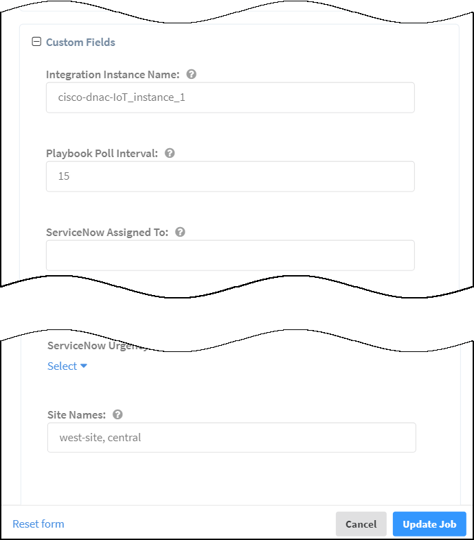 Integration Instance Name: Paste the instance name you copied a few moments ago.Playbook Poll Interval: Enter a number (the value, though unspecified, is minutes) defining the period of time during which Device Security must see device activity to include it in the list of currently active devices it provides to XSOAR. It’s common to use the same interval as the one above for running the recurring job.Site Names: By default, the XSOAR retrieves device data from all sites that Device Security manages. If there are multiple sites and you want to get device data from a subset of them or the DNA Center is managing a subset of them, specify them by name here. Separate multiple names with commas. Use quotation marks around names with spaces. Because the Cortex XSOAR web interface opens in a new browser window, you can return to the previous window with the Device Security portal and navigate to AdministrationSites and FirewallsSites to view a list of site names.