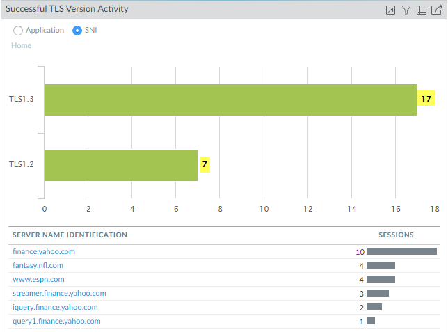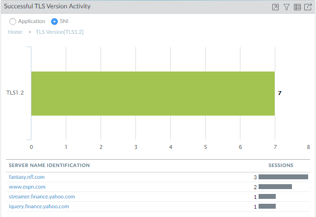 - Successful TLS Version Activity—Shows successful TLS connections by TLS version for applications or SNIs (SNIs are available for Forward Proxy only) so you can evaluate how much risk you are taking on by allowing weaker TLS protocol versions. Identifying applications and SNIs that use weak protocols enables you to evaluate each one and decide whether you need to allow access to it for business reasons. If you don’t need the application for business purposes, you may want to block the traffic instead of allowing it to reduce risk. Click a TLS version to drill down and view the SNIs or applications that used that TLS version. Click an application or an SNI to drill down and see how many of those application or SNI sessions used each TLS version.