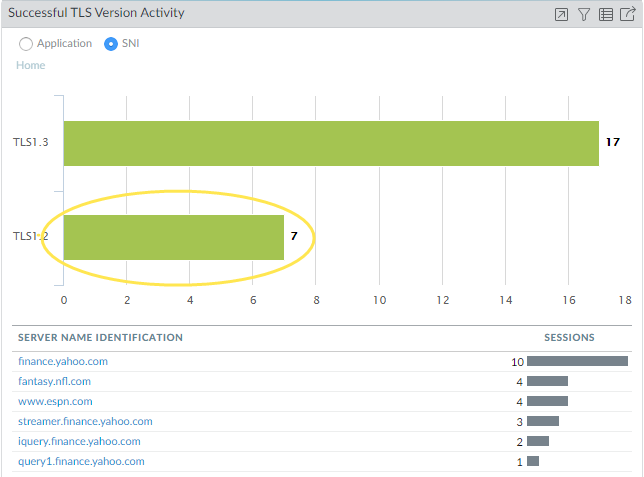 - To see which SNIs used TLSv1.2, click the green bar labeled TLSv1.2.