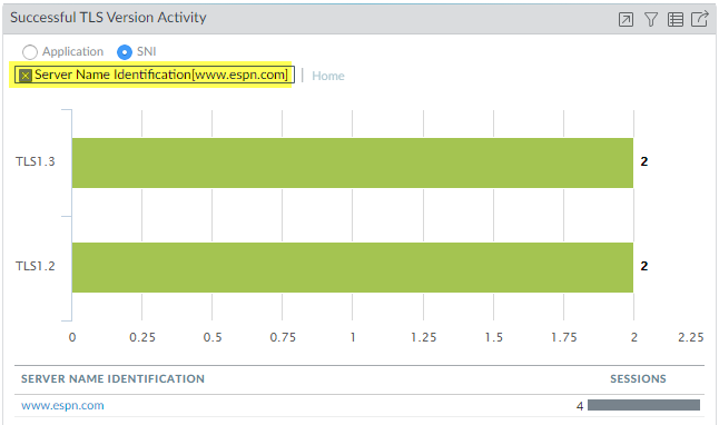 - Clicking Home returns to the home screen. Now, clicking the www.espn.com SNI shows us which TLS versions it used. We can see that two of the four sessions used TLSv1.3 and two used TLSv1.2.