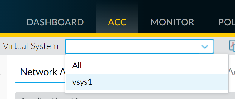 Identify traffic to apply QoS to.Select ACC to view the Application Command Center page. Use the settings and charts on the ACC page to view trends and traffic related to Applications, URL filtering, Threat Prevention, Data Filtering, and HIP Matches.To view information for a specific virtual system, select the virtual system from the Virtual System drop-down:
