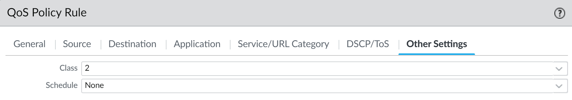 Select Other Settings and select a QoS Class to assign to the QoS policy rule. For example, assign Class 2 to web-browsing traffic on vsys 1: