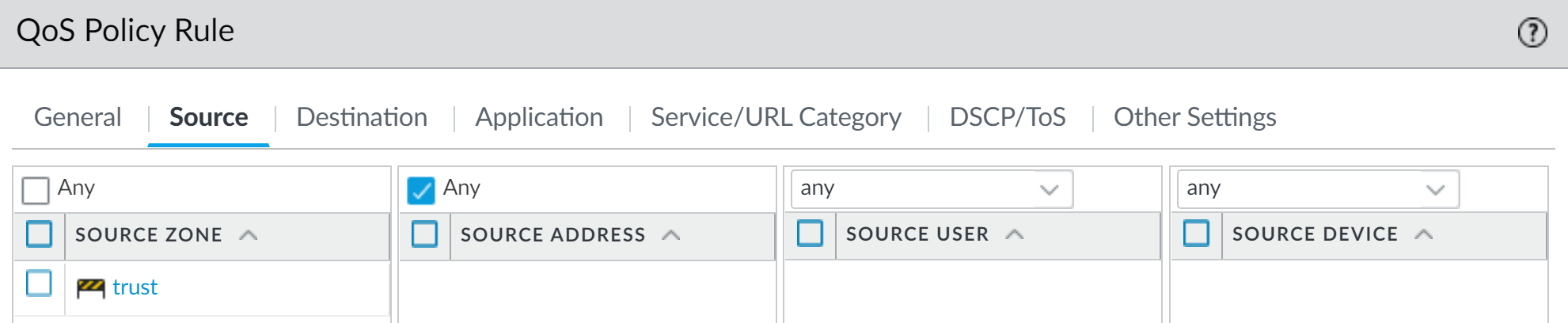 Click OK to save the QoS policy rule.Enable the QoS Profile on a physical interface.It is a best practice to always define the Egress Max value for a QoS interface.- Select NetworkQoS and click Add to open the QoS Interface dialog.Enable QoS on the physical interface: