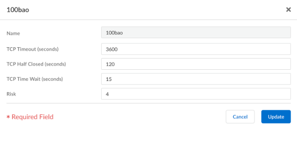Update the details about the application, such as the TCP Timeout, TCP Half Closed, TCP Time Wait, UDP Time Out, and Risk values, to more appropriately fit the needs of your organization's network security requirements.
