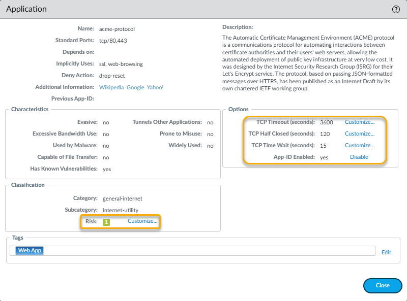 Update the details about the application, such as the TCP Timeout, TCP Half Closed, TCP Time Wait, UDP Time Out, and Risk values, as well as the App-ID Enabled status, to more appropriately fit the needs of your organization's network security requirements.