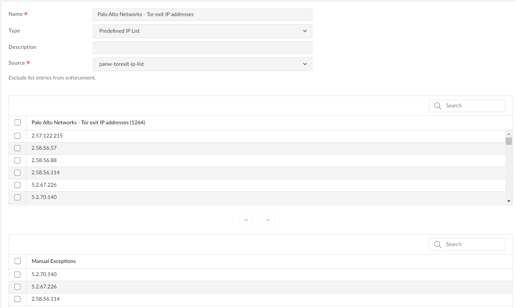 Enter an IP address, domain, or URL (depending on the type of list) in the search field to check if it’s in the list. Exclude entries from an external dynamic list based on which IP addresses, domains, and URLs you need to block or allow.Exclude Entries from an External Dynamic ListAs you view the entries of an external dynamic list, you can exclude up to 100 entries from the list. The ability to exclude entries from an external dynamic list gives you the option to enforce policy on some (but not all) of the entries in a list. This is helpful if you cannot edit the contents of an external dynamic list (such as the Palo Alto Networks High-Risk IP Addresses feed) because it comes from a third-party source.Follow these steps to exclude entries from an external dynamic list to enforce policy on some (but not all) of the entries in a list.- View External Dynamic List Entries.Select up to 100 entries to manually exclude from the list or manually add a list exception.- You cannot save your changes to the external dynamic list if you have duplicate entries in the Manual Exceptions list. To identify duplicate entries, look for entries with a red underline.