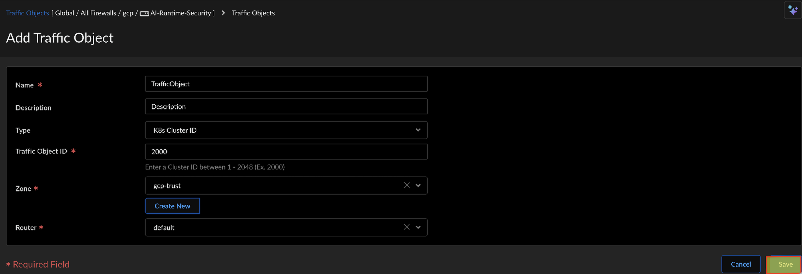 Create traffic objects to specify cloud entities within specific clusters or VPC endpoints to enforce customized security policy rules.This page helps you to create a traffic object with specific cloud assets and map the traffic object to a zone. Attach the zone to a security policy to enforce the policy rules on the AI traffic sourced from this zone. To create a policy object of type traffic objects:- Log in to the Panorama Web Interface.Navigate to Network Traffic Objects.Select Add.