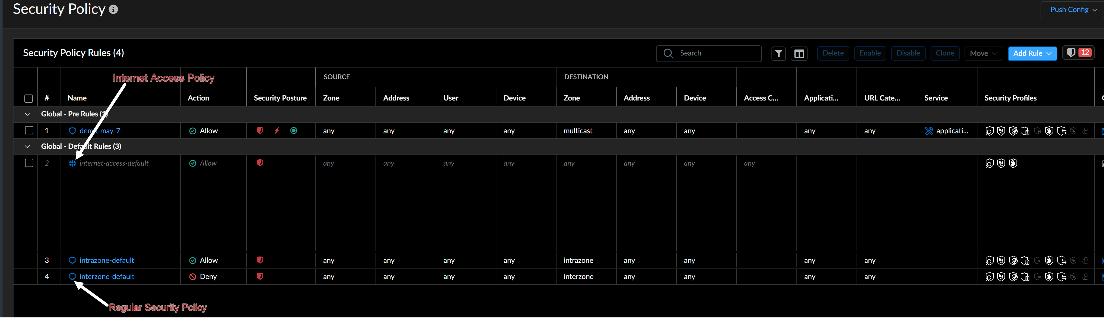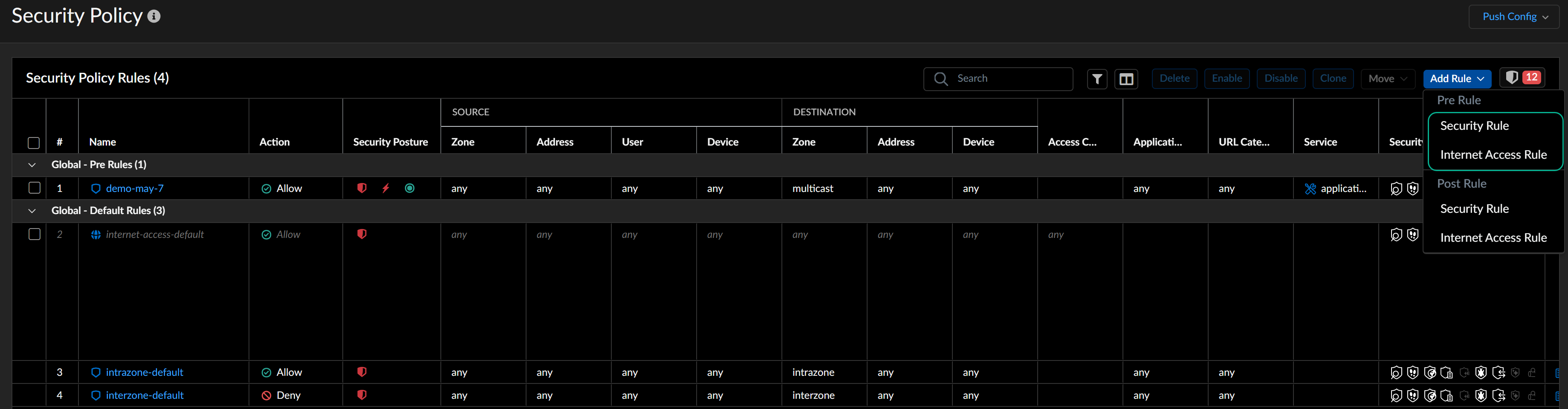 Policies allow you to enforce rules and take action. The different types of security rules that you can create are: Security, NAT, Quality of Service (QoS), Policy Based