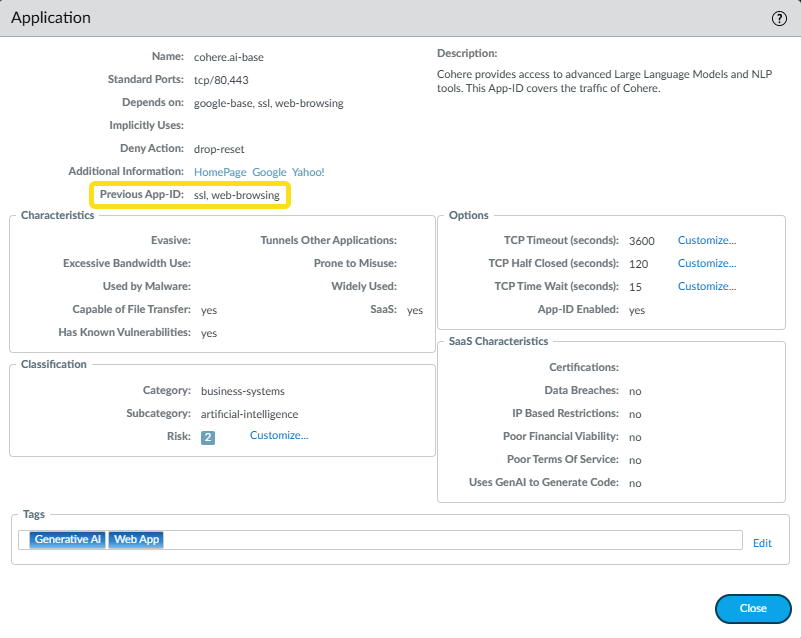 You can also search for applications based on this new attribute. The search bar in the Applications tab supports filtering by Previous App-ID, allowing you to find all applications that used to be identified as a specific legacy App-ID.