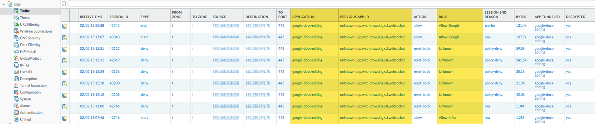 - Log Viewer—Logs display the Application (App-ID) and the associated Rule, but also include the corresponding Previous App-ID, showing the specific attribute that allowed the traffic to pass.