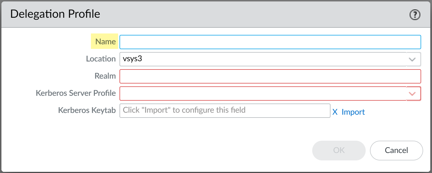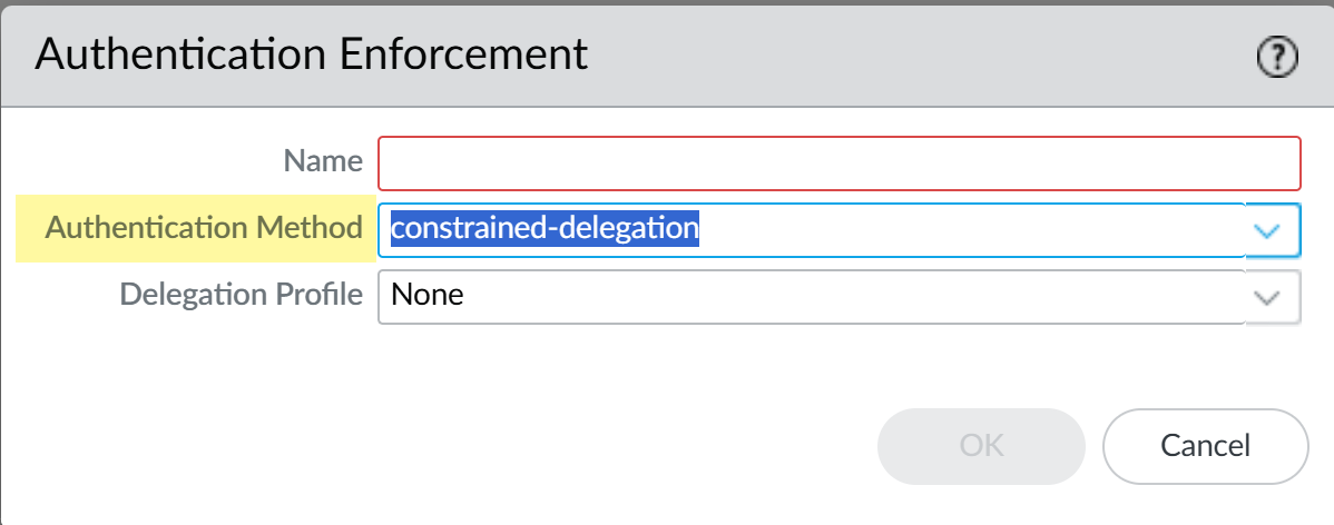 (Panorama only) Select the virtual system Location for the delegation profile.Specify the Kerberos Realm (for example, example.com).Select the Kerberos Server Profile you created in step 2.Import the Kerberos Keytab.Only include the users who require passwordless authentication in the keytab. Passwordless authentication supports keytabs in the AES 256 format.Click OK.Configure the authentication object.- Select ObjectsAuthentication.Add a new Authentication Enforcement object and specify a Name.Select constrained-delegation as the Authentication Method.