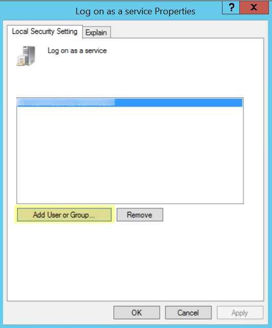 - Right-click Log on as a service, then select Properties.