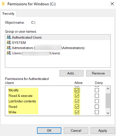 - Add the User-ID agent service account and assign it permissions to Modify, Read & execute, List folder contents, Read, and Write, and then click OK to save the account settings.