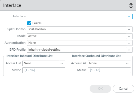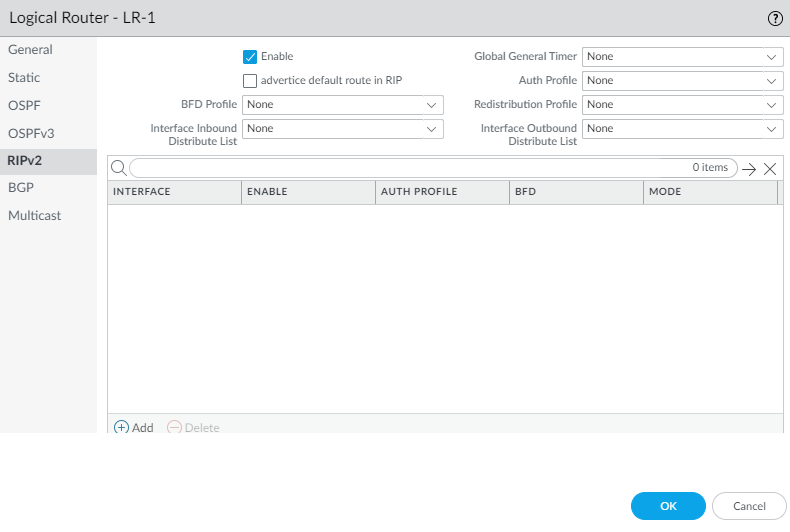 Select advertise default route in RIP to advertise the default route even if it doesn’t exist in the RIB of the routing engine.If you want to apply BFD to RIPv2, select a BFD Profile you created, or select the default profile, or create a new BFD Profile. Default is None (Disable BFD).Select a Global General Timer or create a new RIPv2 Global Timer Profile.Select an Auth Profile or create a new RIPv2 Authentication Profile.Select a Redistribution Profile or create a new Redistribution Profile to redistribute IPv4 static routes, connected routes, BGP IPv4 routes, or OSPFv2 routes to RIPv2.Select a Global Inbound Distribute List to control the incoming routes accepted.Select an Global Outbound Distribute List to control the routes advertised to RIP neighbors.Configure an interface for RIPv2.- Add an Interface by selecting one and Enable it.