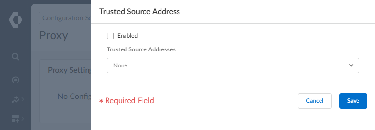 Specify the Client Facing Interface.This is the interface for client traffic that you configured in an earlier step.Specify an Outbound Zone for outgoing traffic to the internet.You can Create New if you don't already have an outbound zone configured.Specify the IP addresses for the primary and secondary DNS servers that you want to connect to.Specify the interface for the DNS proxy connection.(Optional) Specify the Connect Timeout to define (in seconds) how long the proxy waits for a response from the web server. If there is no response after the specified amount of time has elapsed, the proxy closes the connection. The default is 5 seconds.(Optional) Specify the Web Traffic Service Port if you'd like web traffic to use special ports. The default ports are 80 and 443.(Optional) Specify the loopback interface for the proxy that you configured in an earlier step.(Optional) In case of legitimate business need, deselect Reset if SNI does not match HTTP CONNECT.It's recommended to leave this enabled to prevent domain fronting attacks by specifying different domains between the CONNECT request and the Server Name Indication (SNI) field in the HTTP header.Select Save to confirm the changes.Optional Add Trusted Source Addresses. This allows you to specify a list of IP addresses from which X-Authentication-User (XAU) headers are trusted for authentication purposes when using explicit proxy. This ensures that only traffic originating from the designated IP addresses can authenticate using XAU protocol.- Select Device SettingsProxyTrusted Source AddressCustomize.