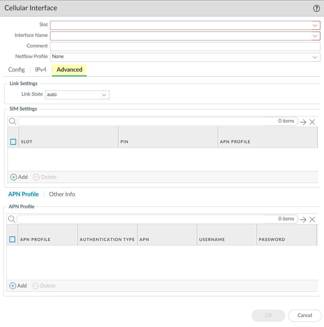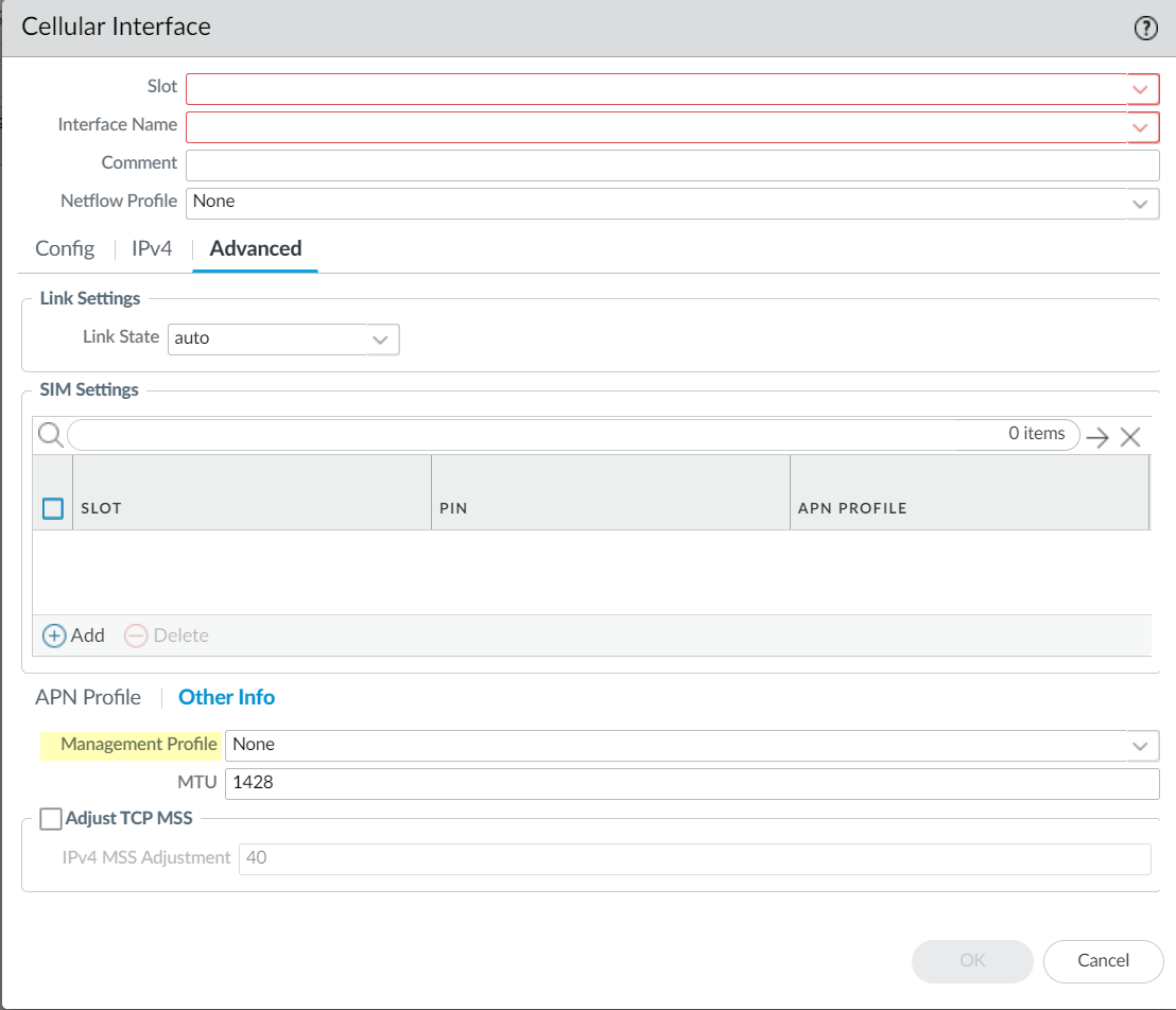 To require a PIN to prevent unauthorized use of the SIM slots, enter a Pin, then Confirm Pin.You can also require a PIN to access the SIM; for more information, see step 17.Select the APN Profile.Specify the APN profile that you want the SIM card to use by default. The SIM slot uses this APN profile unless you override it with a custom APN profile. If you don't specify an APN profile, the firewall uses the default auto APN profile. If you need to specify a custom APN profile, you can do so in step 9.aClick OK.Define the APN Profile.You must configure the APN profile correctly to enable internet access. The APN profile defines the network or networks that the device is permitted to access and determines whether the device receives a dynamic or static IP address. To allow access to data services, some mobile virtual network operators (MVNOs) require a separate APN profile in addition to the APN profile for the network carrier. Based on the carrier, you may also need to enable additional security measures to restrict the APN to authenticated users.- Add the default APN Profile.If necessary, override the default APN profile for the specified slot by selecting an APN profile.