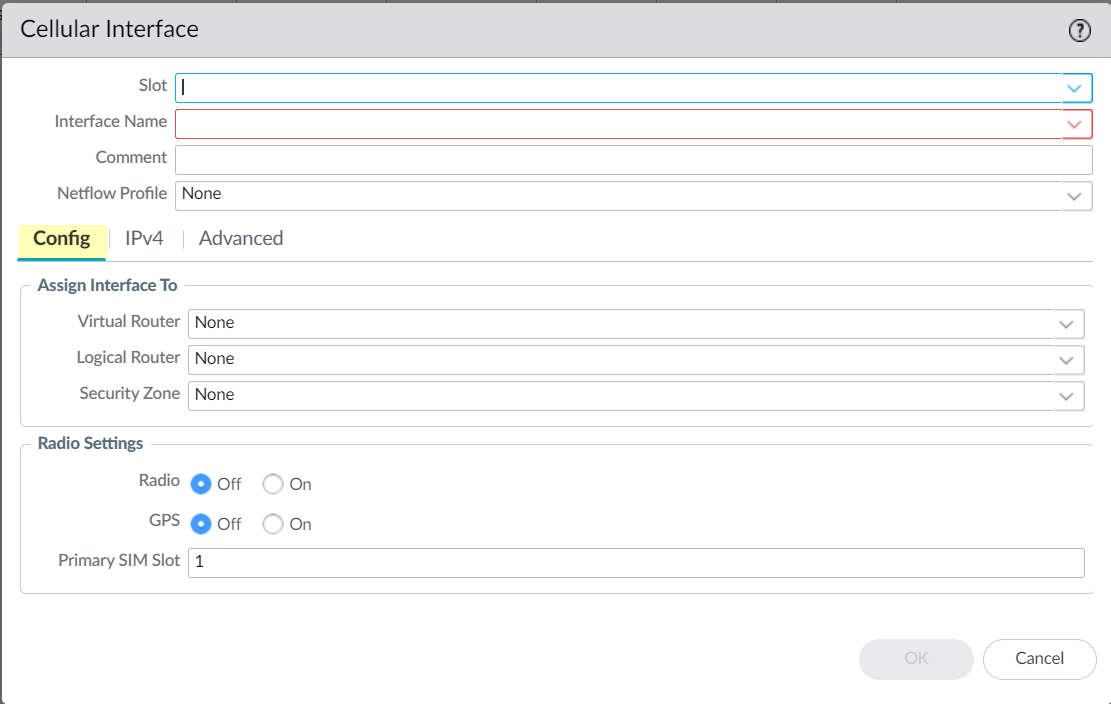 - On the Config tab, if Advanced Routing is enabled, select the Logical Router where you want to assign the interface or create a New Logical Router. (If Advanced Routing is disabled, select the Virtual Router where you want to assign the interface or create a New Virtual Router.)Select the Security Zone or create a New Zone.Select the modem Radio setting.This option allows you to reset the radio settings during troubleshooting.To enable the GPS option, you must enable the Radio option as well as the GPS option.