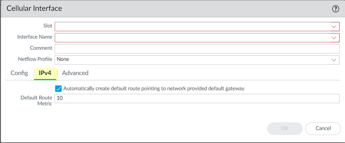On the IPv4 tab, select whether you want to Automatically create default route pointing to network provided default gateway.This option is enabled by default and creates a default route to the default gateway provided by the network.Specify the Default Route Metric.The default is 10; the range is 1 to 65535. If you enable SD-WAN, then you must configure the value for default route metric above 5.(PAN-OS 11.2.3 and later releases) (PAN-OS 11.1.5 and later releases)- On the IPv6 tab, Enable IPv6 on the interface.When IPv6 is enabled on the interface, the APN profile must use a packet data protocol (PDP) type of IPv6 or both (IPv4 and IPv6).Enter the 64-bit extended unique identifier (EUI-64) in hexadecimal format (for example, 00:32:07:FE:4A:12:4C:33). If you leave this field blank, the firewall uses the EUI-64 generated from the MAC address of the physical interface.Select Automatically create default route pointing to network provided default gateway.This option is enabled by default and creates a default route to the default gateway provided by the network.Enter the Default Route Metric; default is 10; range is 1 to 65535.(Optional) (PAN-OS 11.2.3 and later releases, SD-WAN plugin 3.3.1 and later releases) Configure the SD-WAN settings.