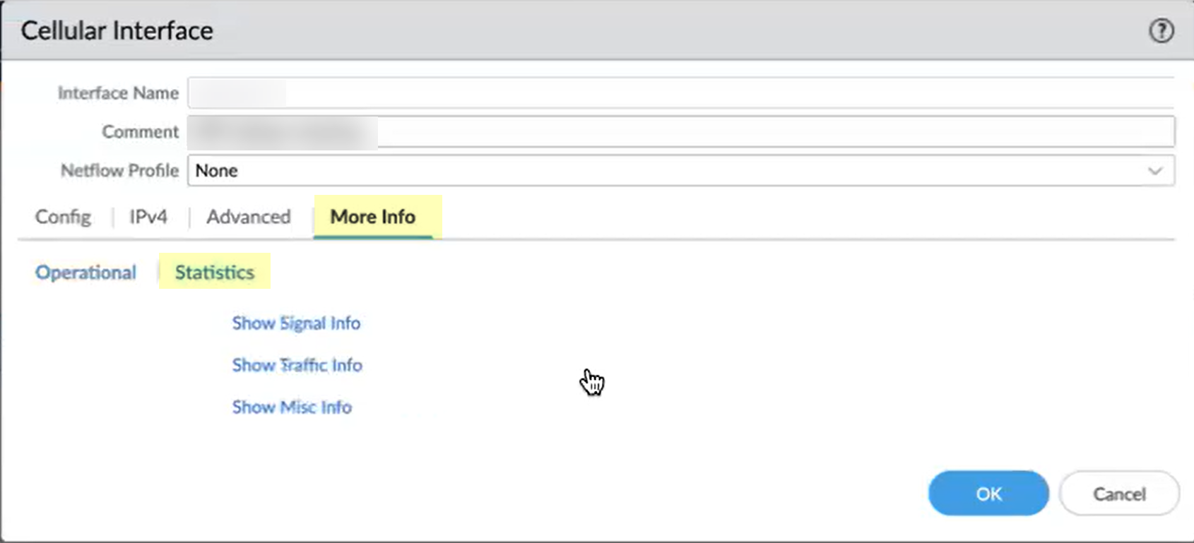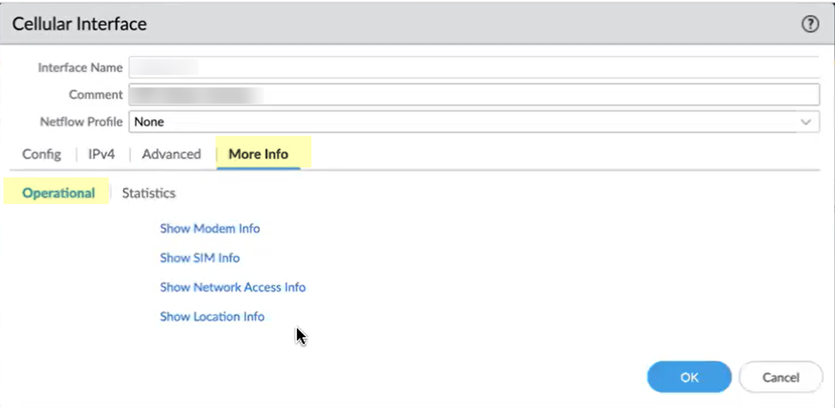 Verify your configuration's operational information is correct.To view the statistics and operational information using Panorama, first select the device, then select the information you want to view.- Select the cellular interface you configured then click More InfoOperational.