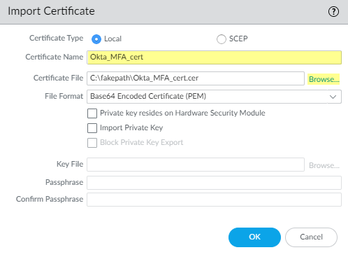 As a prerequisite, confirm that you have mapped all users that you want to authenticate using Okta.- Import all certificates in the certificate chain on the firewall and add the imported CA certificates (root and intermediate) to a Certificate Profile.