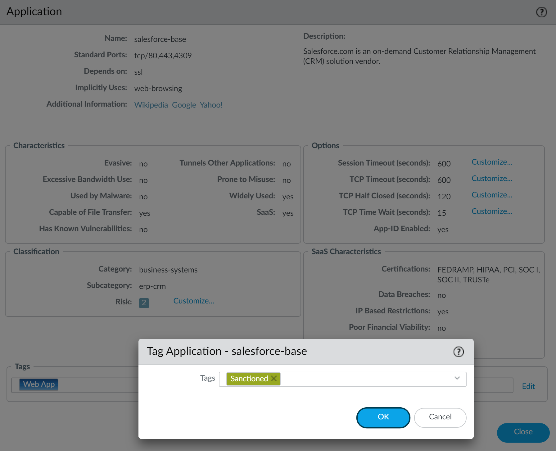 - Select ObjectsApplications.Click the application Name to edit an application and select Edit in the Tag section.Select Sanctioned from the Tags drop-down.You must use the predefined Sanctioned tag (). If you use any other tag to indicate that you sanctioned an application, the firewall will fail to recognize the tag and the report will be inaccurate.