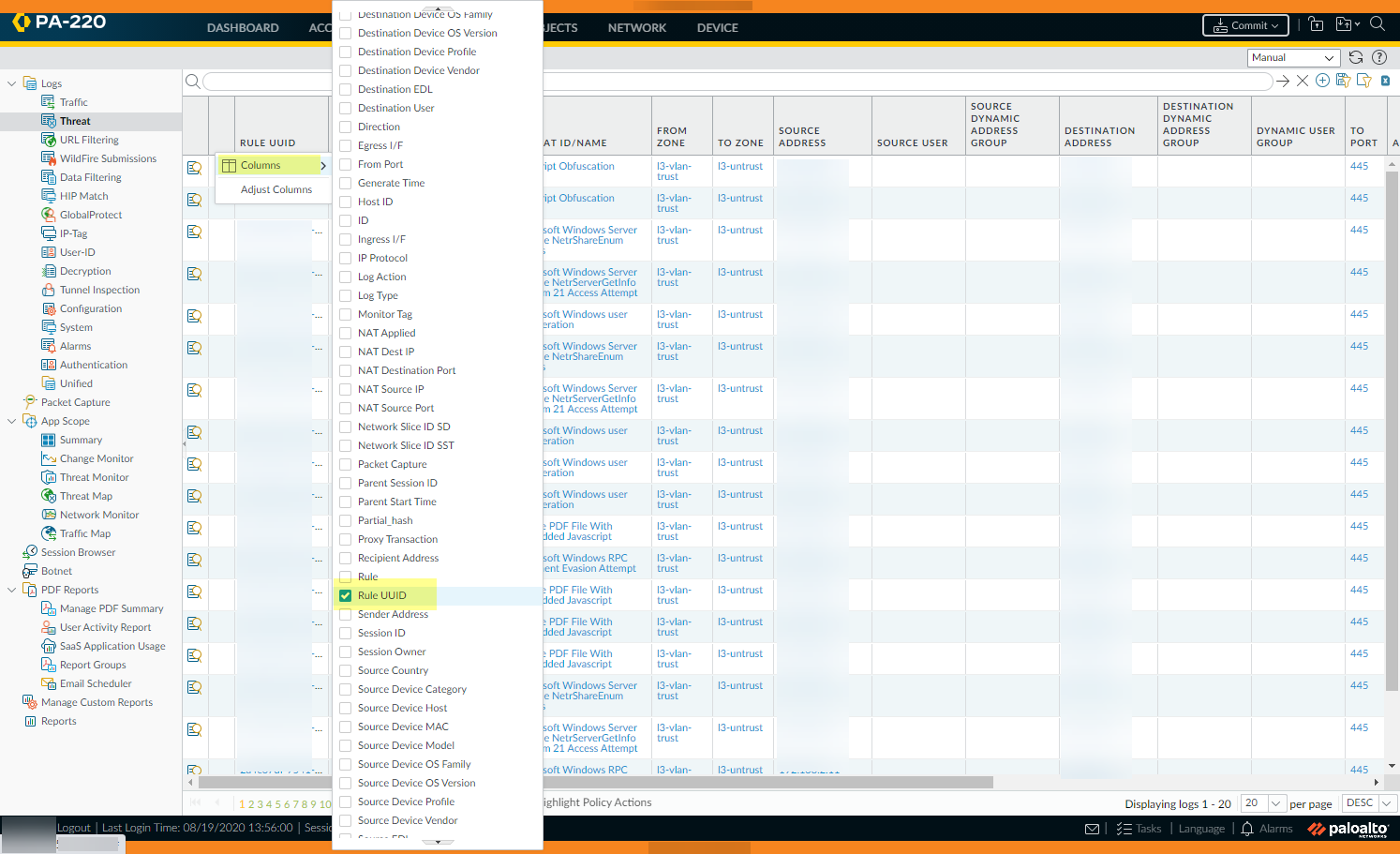 • Display the Rule UUID column for logs and the UUID column for policy rules.