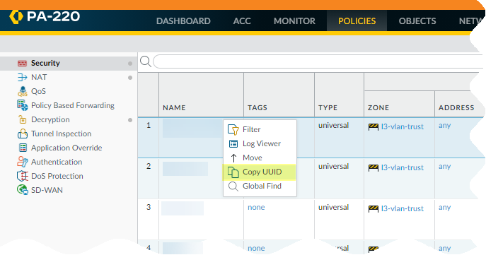 Copying the UUID allows you to paste the UUID in to searches, the ACC, custom reports, filters, and anywhere else you want to locate a rule identified by that UUID.
