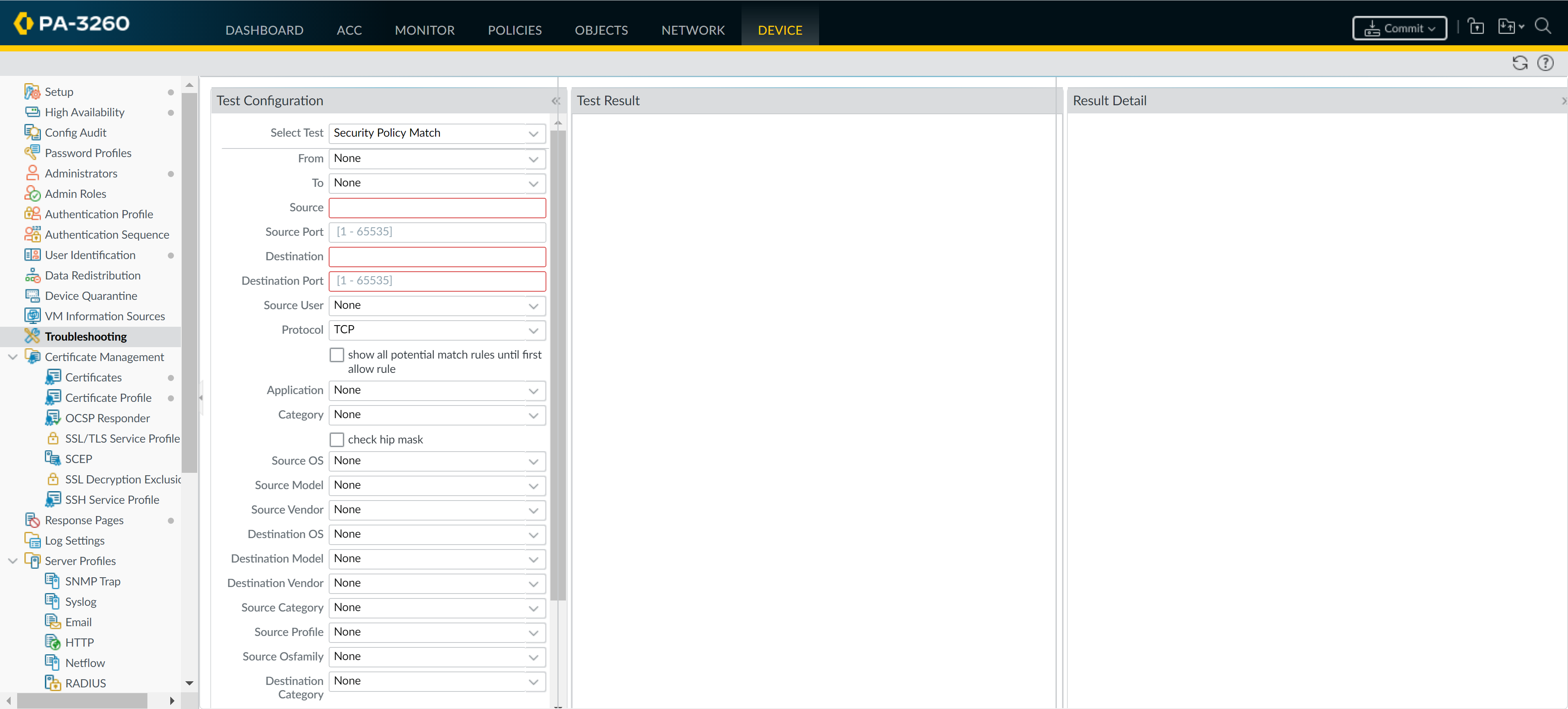 - To verify the policy rule that matches a flow, select DeviceTroubleshooting, and execute a Security Policy Match test: