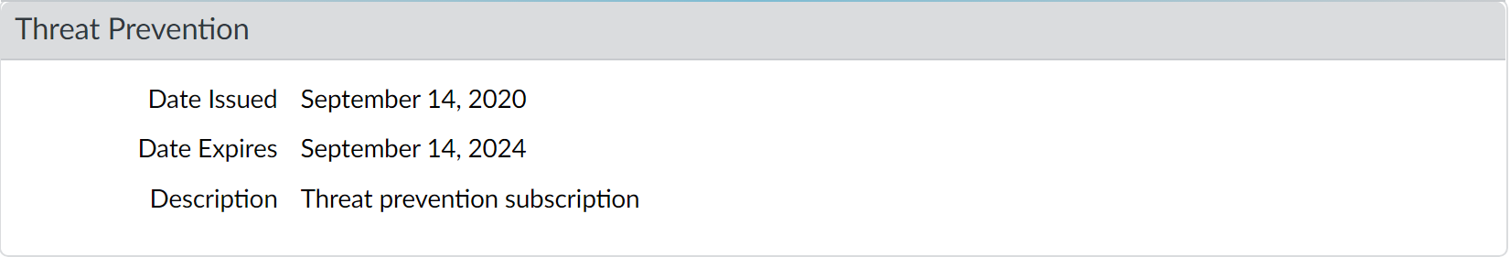 - Verify that you have a Threat Prevention subscription.The Threat Prevention subscription bundles the antivirus, anti-spyware, and vulnerability protection features in one license. To verify that you have an active Threat Prevention subscription, select DeviceLicenses and verify that the Threat Prevention expiration date is in the future.