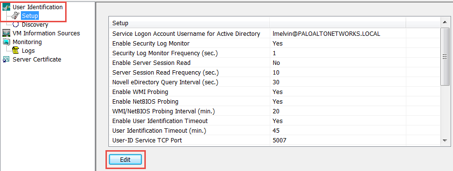 Enable the User-ID agent and the User Agent Credential service (which runs in the background to scan permitted credentials) to share information.- On the RODC server, launch the User-ID Agent.Select Setup and edit the Setup section.