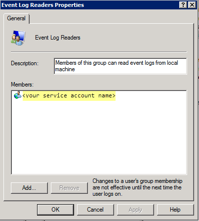 - Confirm that the builtin Event Log Reader group lists the service account as a member.