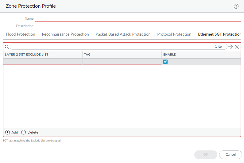 - Select NetworkNetwork ProfilesZone Protection.Add a Zone Protection profile by Name.Select Ethernet SGT Protection.Add a Layer 2 SGT Exclude List by name.Enter one or more Tag values for the list; range is 0 to 65,535. You can enter individual entries that are a contiguous range of tag values (for example, 100-500). You can add up to 100 (individual or range) tag entries in an Exclude List.Enable the Layer 2 SGT Exclude List. You can disable the list at any time.Click OK.