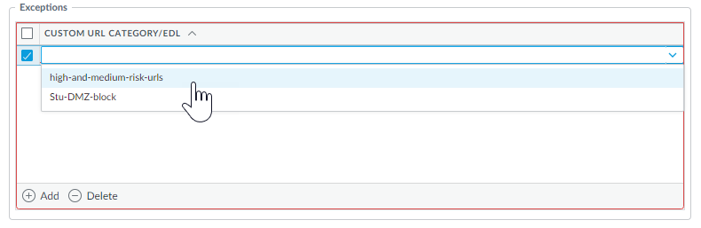 (Optional) Add URL exceptions to your URL Filtering Security profile if you encounter false-positives.- Select Objects > Security Profiles > URL Filtering.