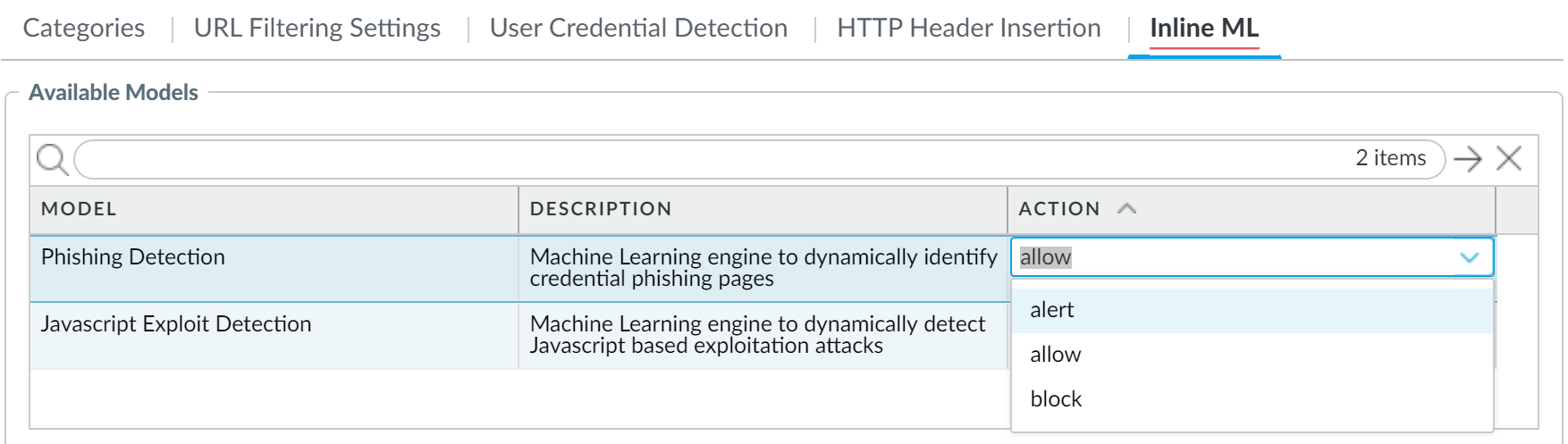- Select your URL Filtering profile and then go to Inline ML and define a policy Action for each URL Filtering model. There are two URL classification engines: Phishing and JavaScript Exploit, one for each type of malicious webpage content.