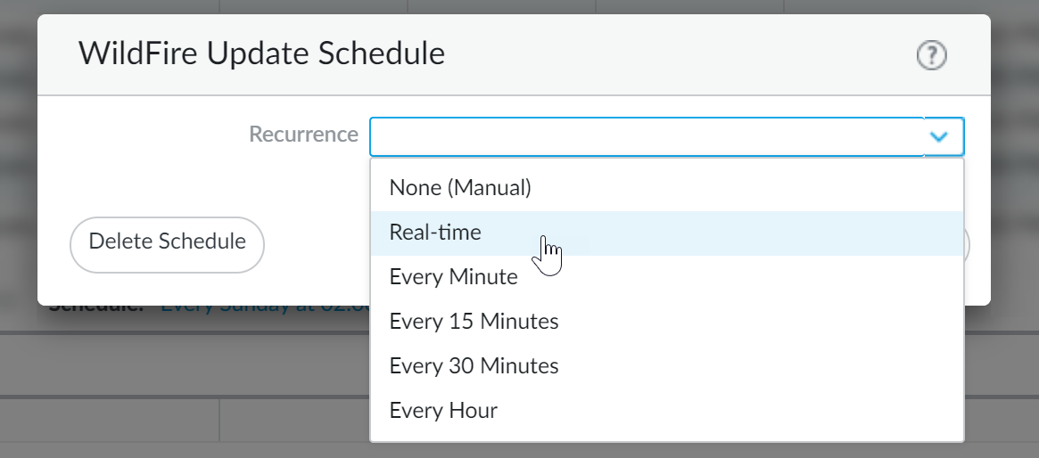 - Select DeviceDynamic Updates.Select the Schedule for WildFire updates.Set the Recurrence (how often the firewall checks the Palo Alto Networks update server for new signatures) for Real-time updates.Click OK to save the WildFire update schedule and then Commit your changes.