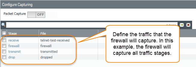 Click OK.Set Filtering to On.Specify the traffic stage(s) that trigger the packet capture and the filename(s) to use to store the captured content. For a definition of each stage, click the Help icon on the packet capture page.For example, to configure all packet capture stages and define a filename for each stage, perform the following procedure:- Add a Stage to the packet capture configuration and define a File name for the resulting packet capture.For example, select receive as the Stage and set the File name to telnet-test-received.