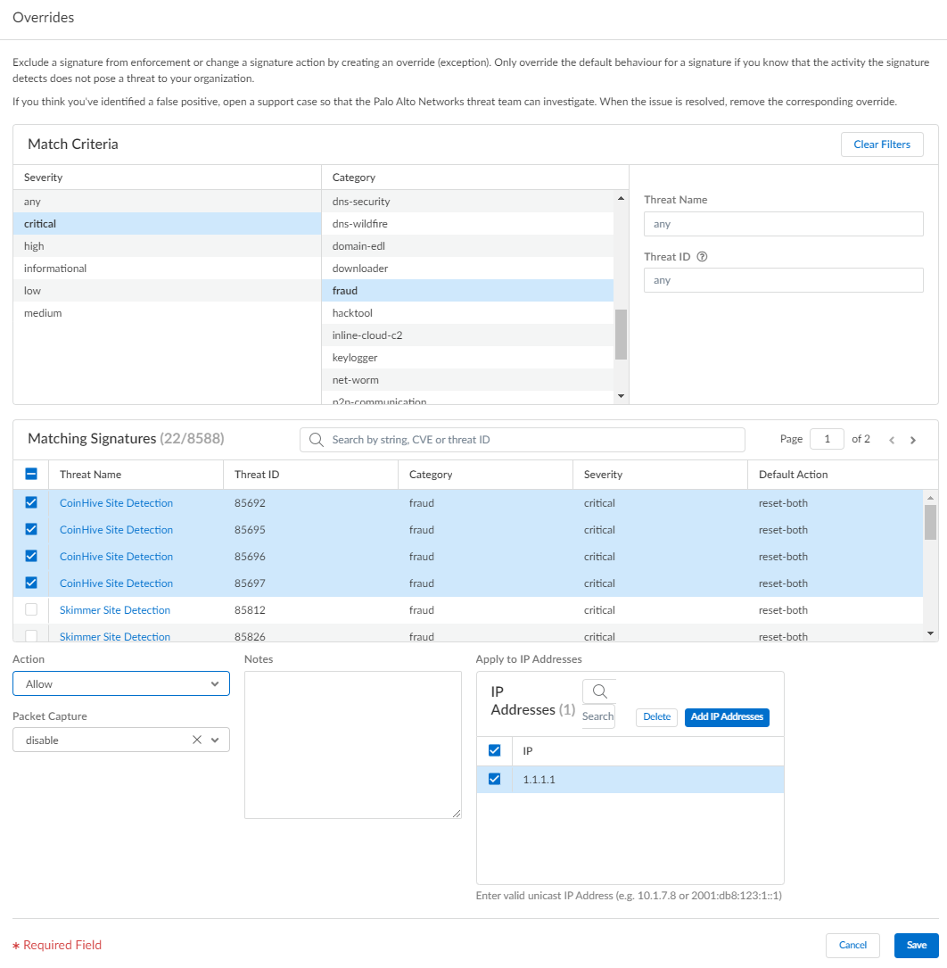 Repeat to add additional exceptions or click Save after all of your threat exceptions have been added.Modify enforcement for vulnerability and spyware signatures (except DNS signatures; while they are a type of spyware signature, DNS signatures are handled through the DNS Security subscription in Prisma Access).- Select ConfigurationNGFW and Prisma AccessSecurity ServicesAnti-Spyware or ConfigurationNGFW and Prisma AccessSecurity ServicesVulnerability Protection, depending upon the signature type.Add Profile or select an existing Anti-Spyware or Vulnerability Protection profile from which you want to modify the signature enforcement, and then select Add Override.Search for spyware or vulnerability signatures by providing the relevant Match Criteria. This automatically filters the available signatures and displays the results in the Matching Signatures section.Select the check box for the signature(s) whose enforcement you want to modify.Provide the updated Action, Packet Capture, and IP Addresses that you want the modified enforcement rules to apply to for the selected signatures.