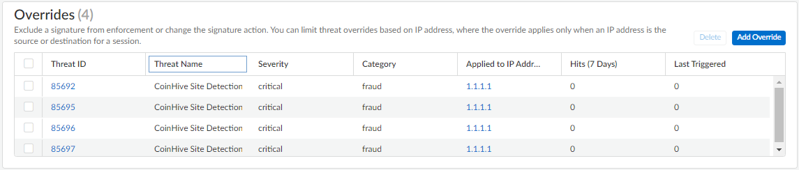 Save your updated signature enforcement configuration.You can view a complete list of Overrides including various statistics, as well as Delete entries that are no longer necessary.